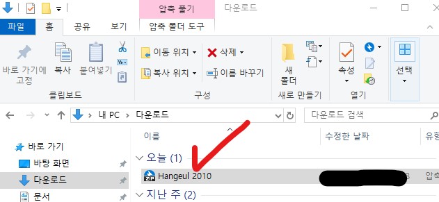 ◆‘다운로드’ 폴더에 한글 2010 무료 다운로드 압축파일 그대로 압축파일을 풀어보겠니다. ‘확인’ 클릭하시면 됩니다.