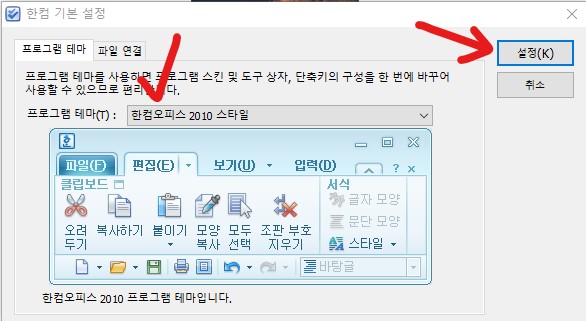 ◆한글 2010 설치가 완료되면 ‘설정’을 완료하라는 안내창이 뜹니다. 저는 프로그램 테마만 ‘한컴오피스 2010 스타일로 선택해서 ‘설정’ 클릭했습니다.