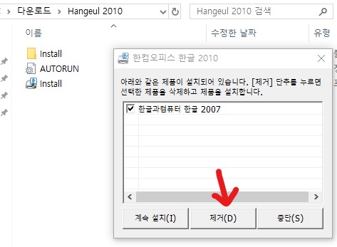 ◆현재 저의 컴퓨터에는 한글 2007이 설치 되어 있습니다. 그래서 한글 2010 설치를 하기전에 ‘제거’ 하라는 안내창이 뜨네요. ‘제거’를 클릭하고 한글 2010 설치를 진행해보겠습니다. (한글 2007이라던가 이전 버전을 사용중이지 않으신 분들은 ‘제거’ 안내창이 뜨지 않고 한글 2010 설치가 그대로 진행될겁니다.)