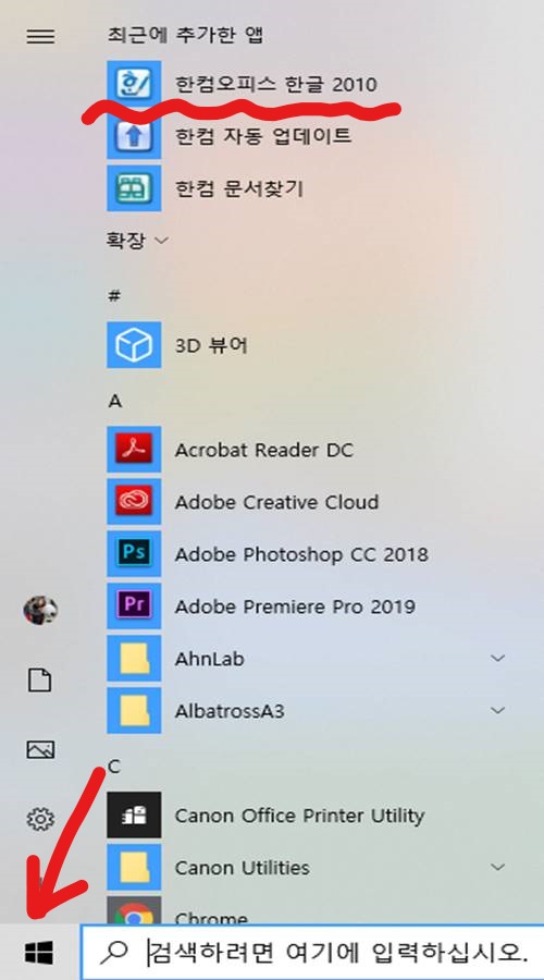 ◆윈도우 버튼을 눌러보면 다음과 같이 시작창에서도 ‘한글 2010’가 설치된게 확인됩니다. 드디어 한글 2010 설치 와 설정 까지 마쳤습니다!!