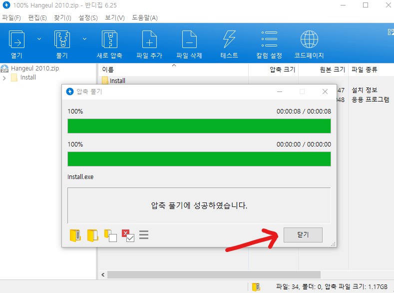 한글 2010 무료 다운로드 압축파일 풀기가 완료되면 ‘닫기’ 클릭해주고 압축 풀린 폴더로 들어갑니다.