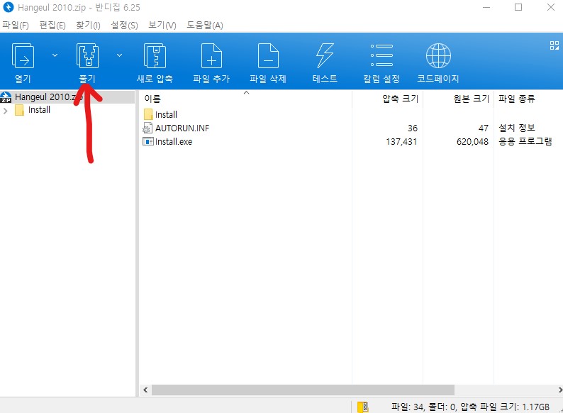 ◆한글 2010 무료 다운로드 압축파일을 풀어야겠지요. Hangeul 2010 압축파일을 더블클릭합시다. 아래의 사진과 같이 화면이 뜰겁니다. 저는 압축프로그램 중에서 ‘반디집’ 프로그램을 사용중입니다. ‘풀기’를 클릭해봅시다.