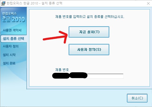 ◆한글 2010 설치 종류는 ‘지금 설치’를 클릭하시면 됩니다. 한글 2010 설치 제품번호는 자동으로 입력되어있을겁니다.