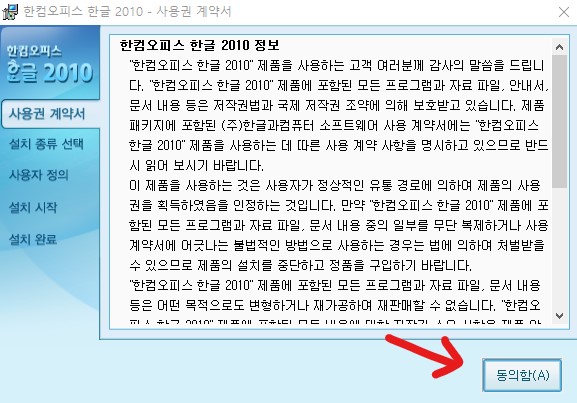 ◆(한글 2007 제거가 완료되면) 한글 2010 설치 창이 이렇게 뜹니다. 한글 2010 설치 사용권 계약서 ‘동의’ 클릭하세요.