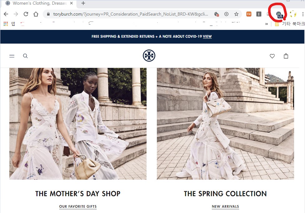◆컴퓨터 VPN우회 무료 프로그램 Browsec 를 켜고 다시 TORY BURCH를 접속해보면, 다른 URL로 접속이 되면서 봄 컬렉션을 조회할수 있는 웹사이트로 접속이 원활하게 되는것을 확인할수 있습니다.