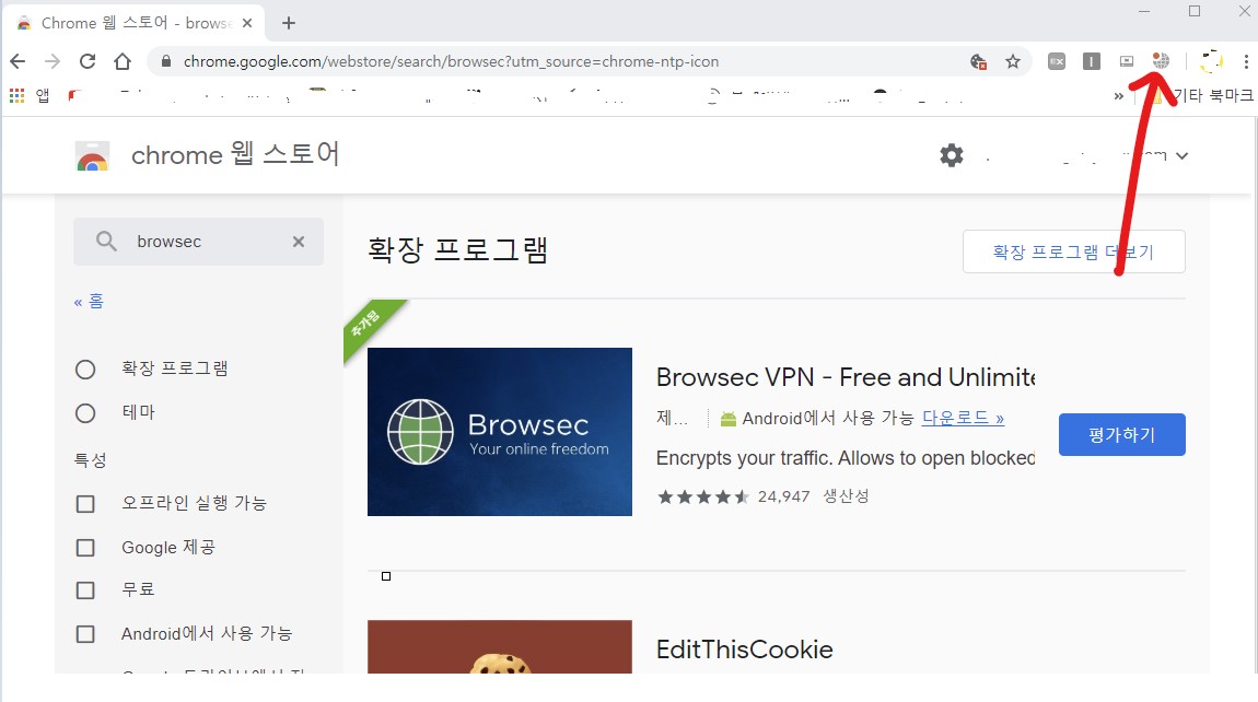 ◆컴퓨터 VPN우회 무료 프로그램 Browsec 를 설치가 완료되면 빨간색 화살표와 같이 구글 크롬 창에서 오른쪽 상단에 예전에는 없었던 확장 프로그램 버튼이 생성 됩니다.