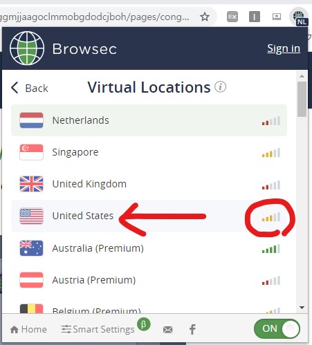 ◆‘Change’ 버튼을 누르면 컴퓨터 VPN우회 무료 프로그램 Browsec에서 US로 선택할수 있는 창이 뜹니다. 네덜란드 보다 연결 속도도 빠르게 표시되네요. US로 클릭 해서 설정을 연결 국가를 변경 해봅시다.
