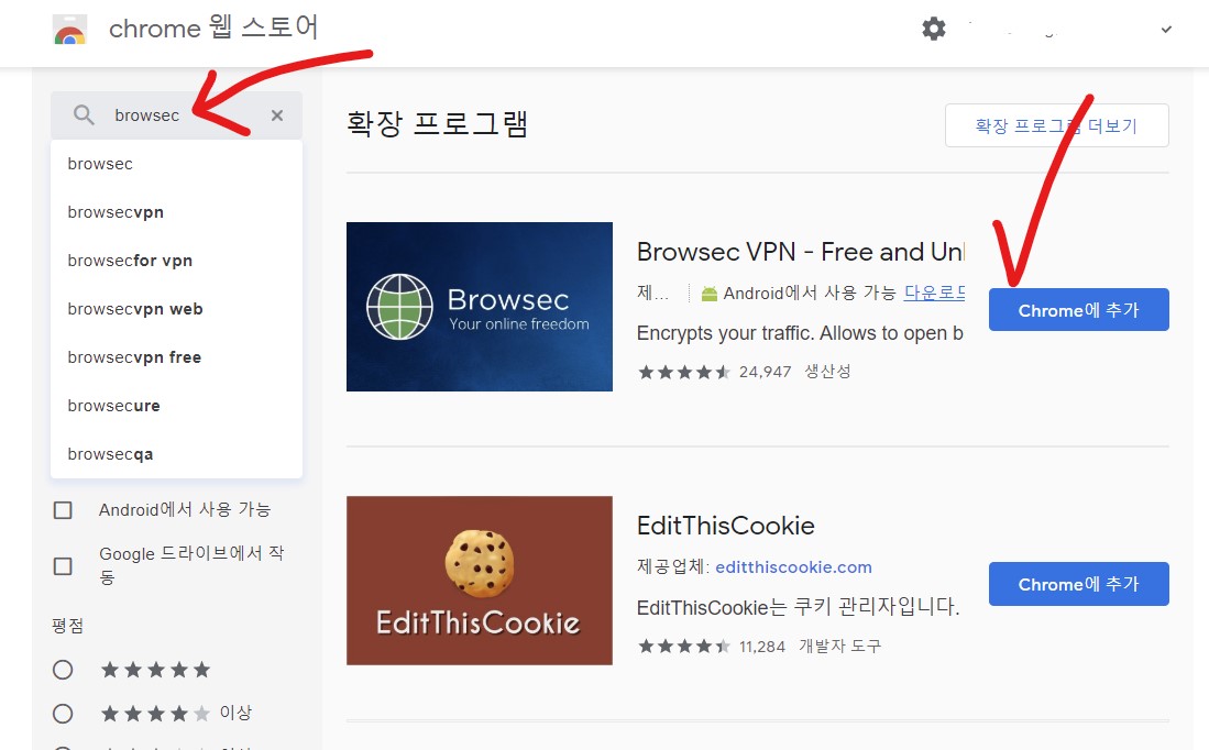 ◆컴퓨터 VPN우회 무료 프로그램 Browsec 을 검색해야하겠지요. browsec 이라고 넣고 클릭하니 확장프로그램 컴퓨터 VPN우회 무료 프로그램 Browsec 이 오른편에 검색됩니다. 빨간색 체크표시에 ‘Chrome 에 추가’ 를 클릭하면 구글 크롬 브라우저 내에 확장 프로그램 설치가 시작됩니다.