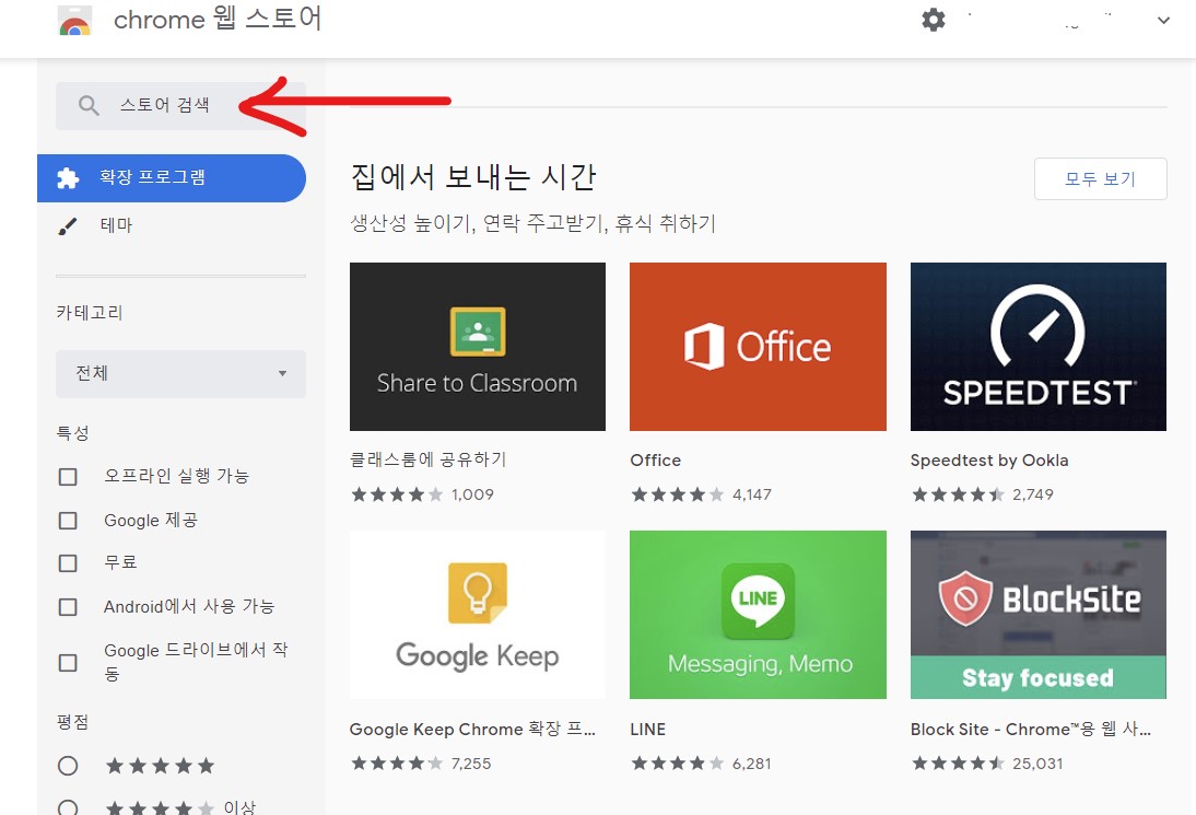 ◆자! 이제 구글 크롬 웹스토어에 접속하셨다면, 아래와 같은 화면이 뜰겁니다. ‘스토어 검색’을 클릭하면 우리가 원하는 확장프로그램을 검색할수 있습니다. 검색을 시작해 봅시다.