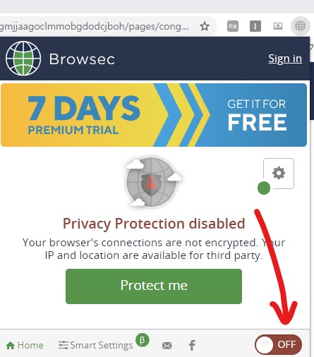◆구글 크롬 창에서 오른쪽 상단에 새롭게 생성된 컴퓨터 VPN우회 무료 프로그램 Browsec 버튼을 클릭하면, 다음과 같은 창이 뜹니다. 현재 Off 상태인데요. 클릭해서 On으로 켜봅시다.