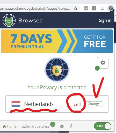 ◆컴퓨터 VPN우회 무료 프로그램 Browsec 실행이 되면서 네덜란드 IP로 접속이 되어있다는 표시가 나오네요. 구글 크롬 창에서 오른쪽 상단에 새롭게 생성된 컴퓨터 VPN우회 무료 프로그램 Browsec 버튼도 흑백 색깔에서 컬러 색깔로 바뀌네요. 네덜란드 IP는 속도도 느리기도 하고 해외 직구는 대부분 미국 사이트를 통해서 접속 하기 때문에 국가 변경을 해보겠습니다. ‘Change’ 버튼을 클릭해봅시다.