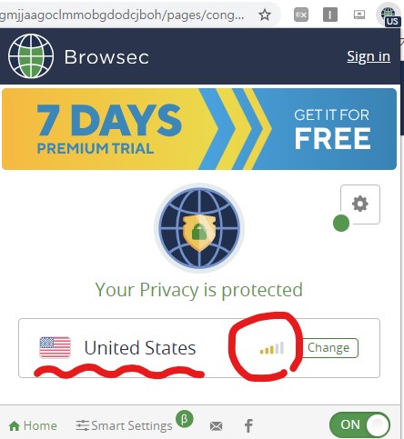 ◆컴퓨터 VPN우회 무료 프로그램 Browsec 에서 US로 연결 국가 설정이 완료되면 이렇게 표시됩니다. 정말 간단하죠?