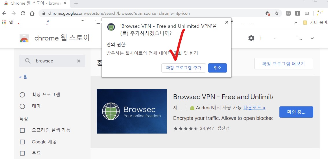 ◆컴퓨터 VPN우회 무료 프로그램 Browsec 를 설치 확인을 묻는 창이 뜨면, ‘확장 프로그램 추가’ 를 확인해 줍시다.